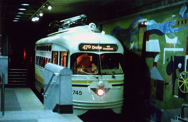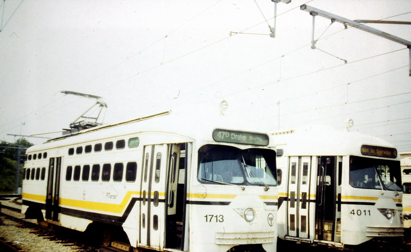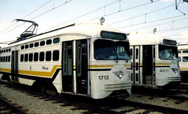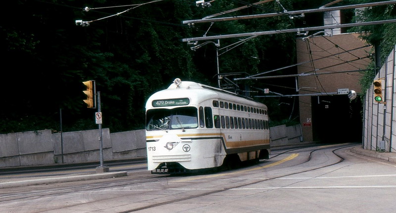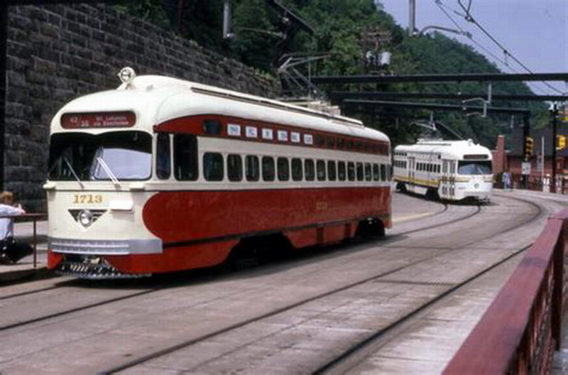 1713 and unknown PCC inbound at Station Square. 1713 for a while was painted beautifully in the old school Pittsburgh Railways colors.