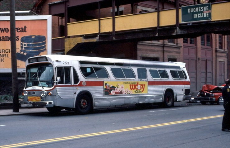 2223 at bottom of the Duquesne Incline on March 30, 1978 after being rear ended while stopping to pick up passengers.