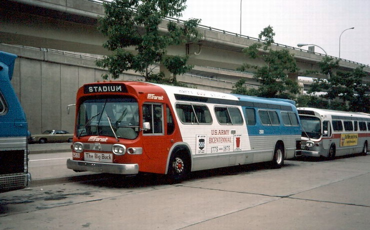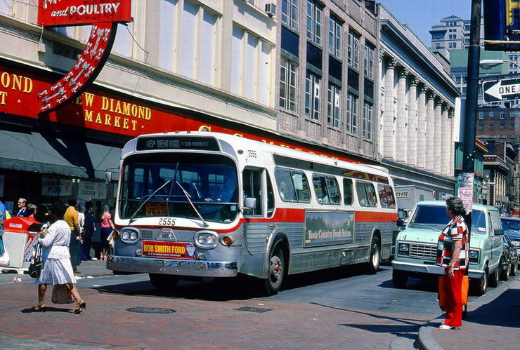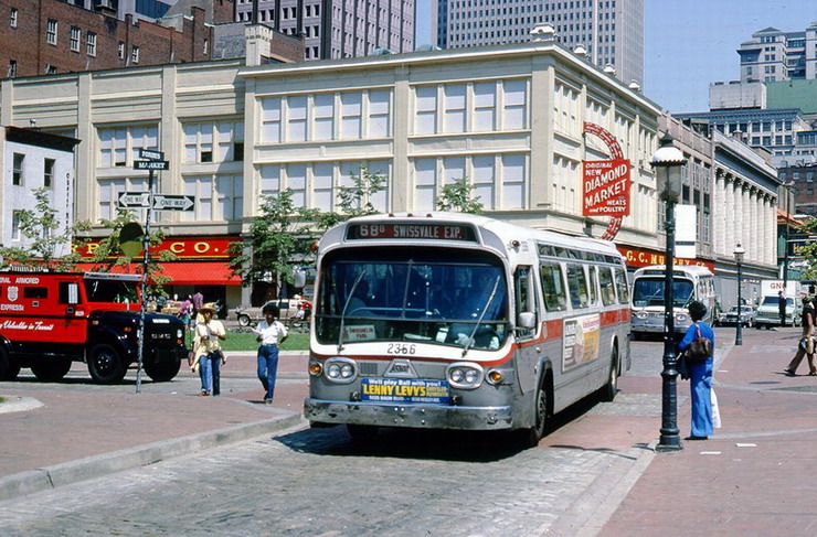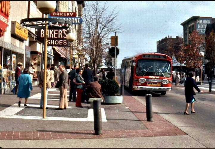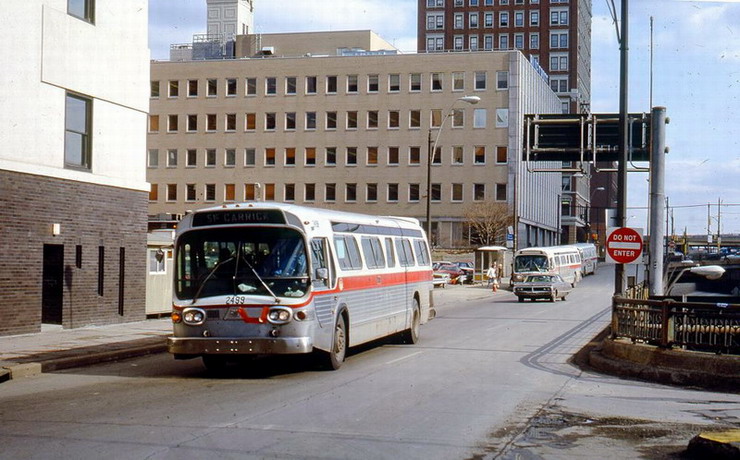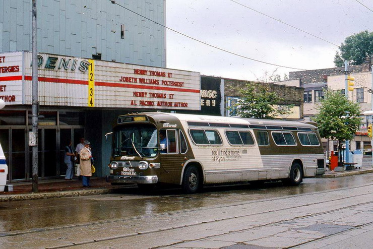 Unknown coach stopping for a movie in Mt. Lebanon on Washington Rd. I do believe this was the only fishbowl to be painted brown.