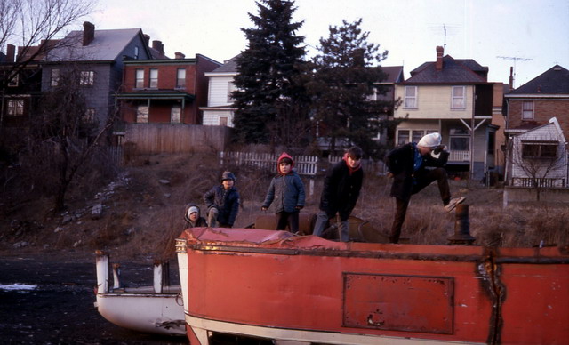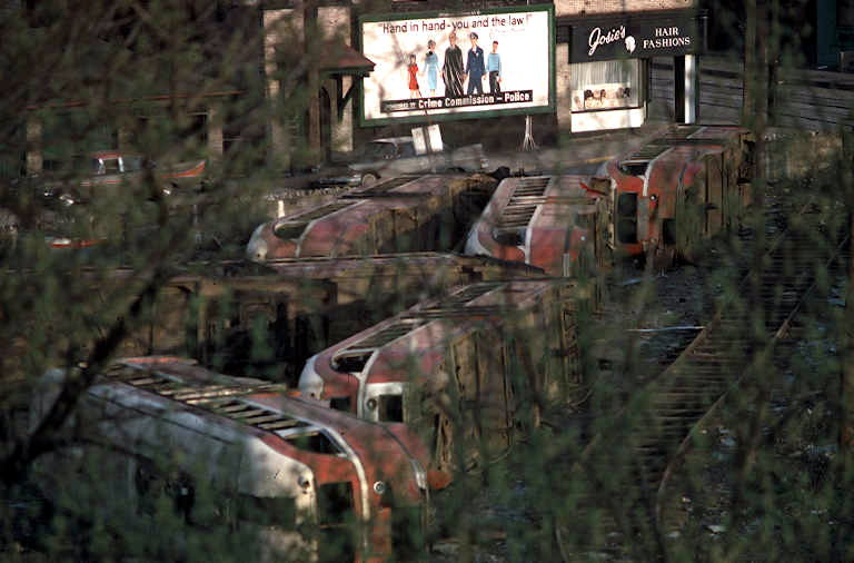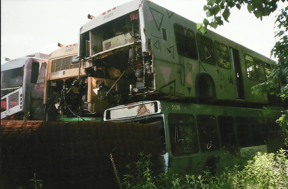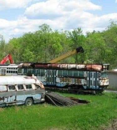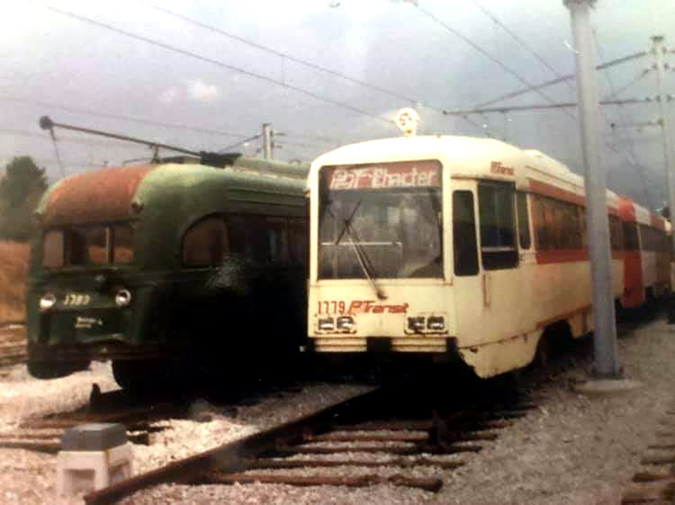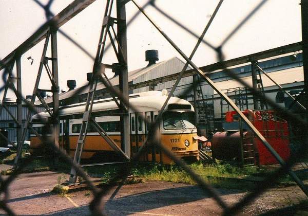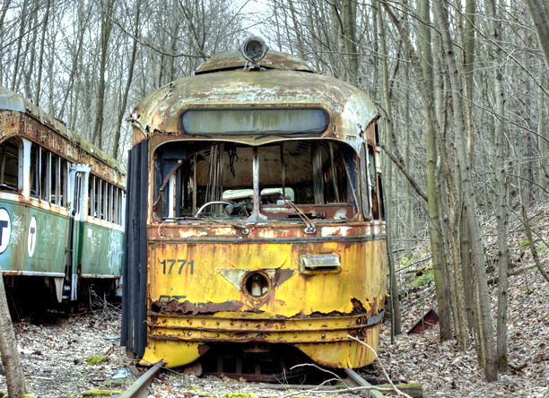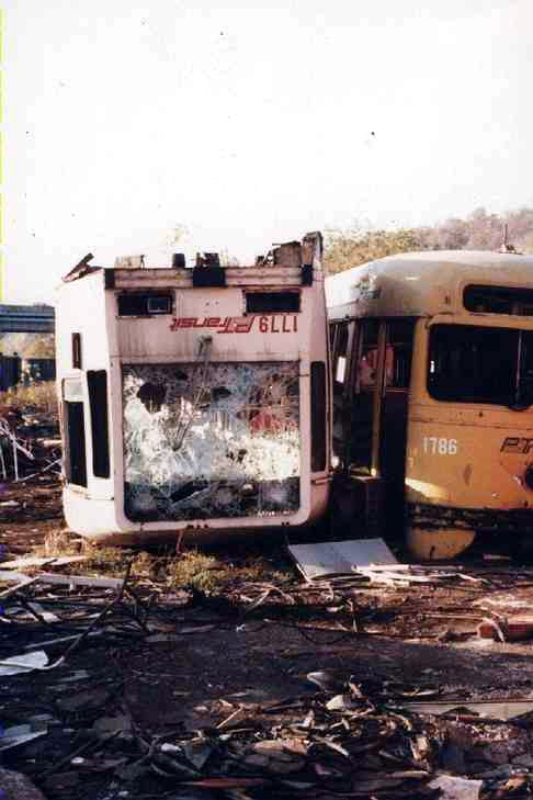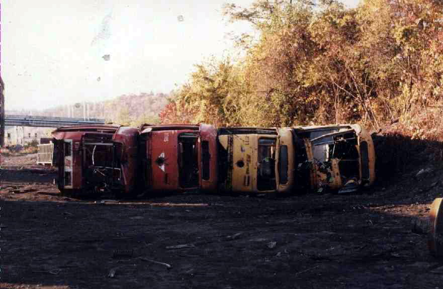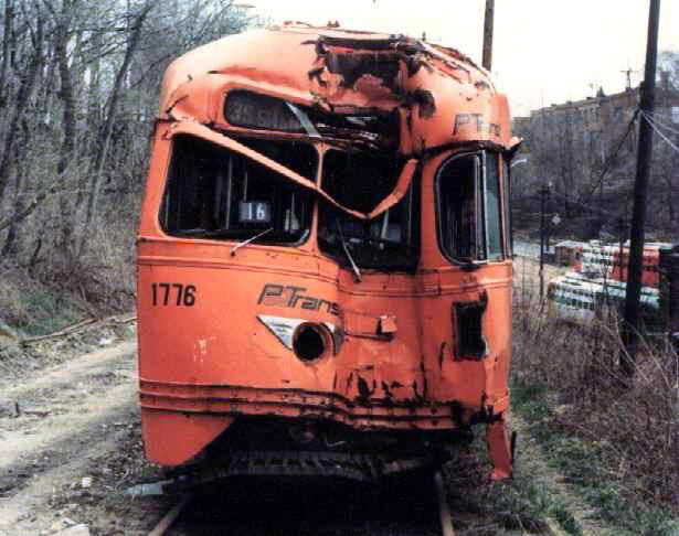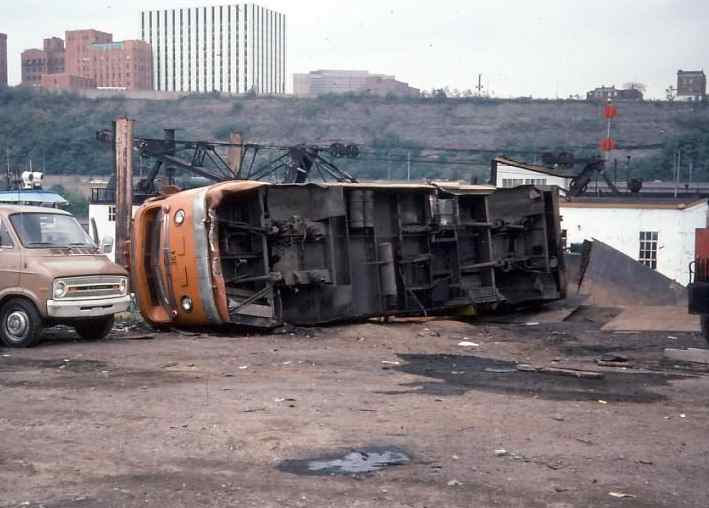 Ex Bicentennial PCC, in Orange Livery, Smashed beyond repair, at the old South Hills Junction.