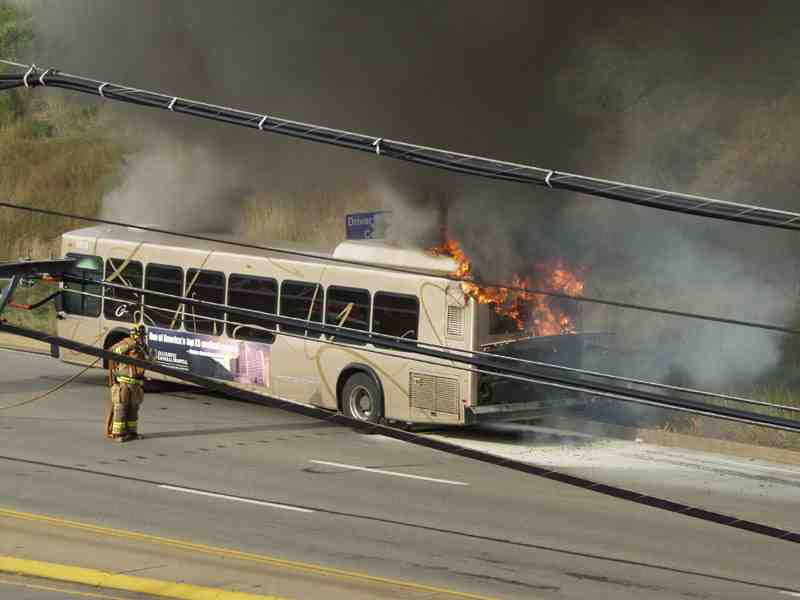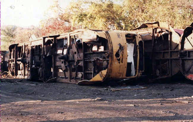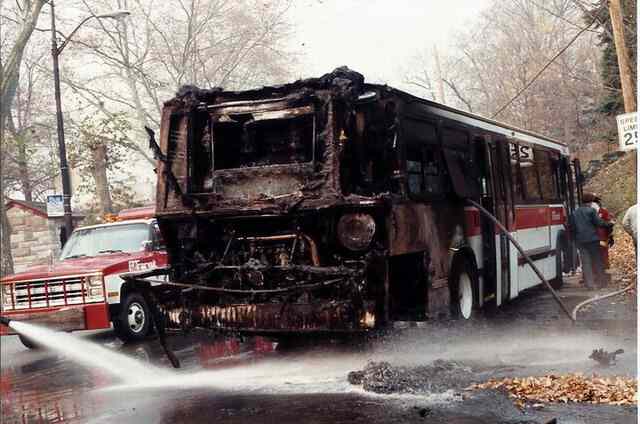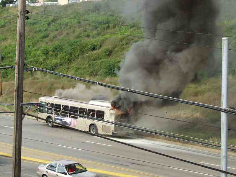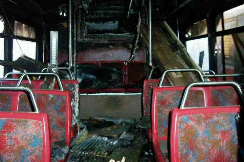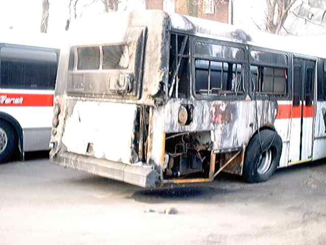 This is the end result when Neoplan low floor coach 5019 burned up. Below are a few of the "fire" shots. I personally liked this bus, it was a good one.