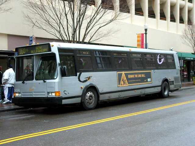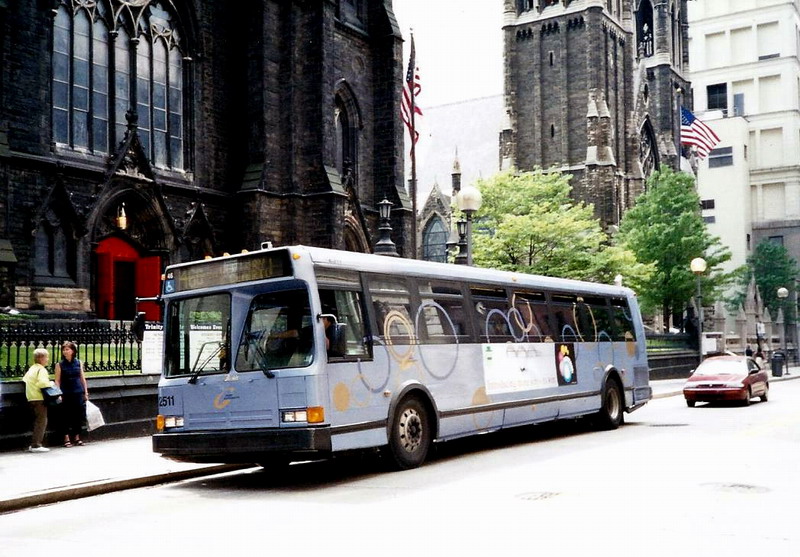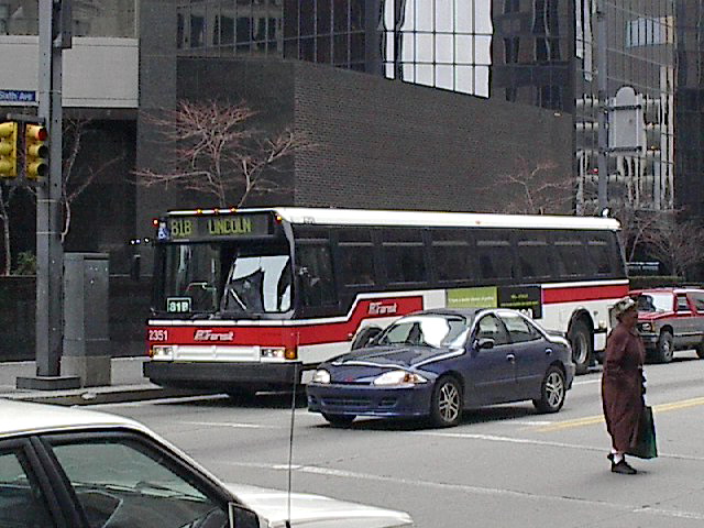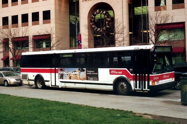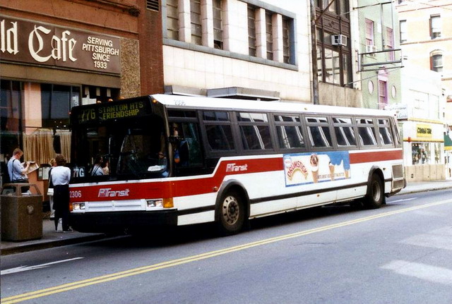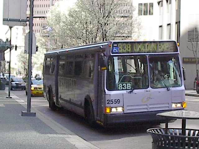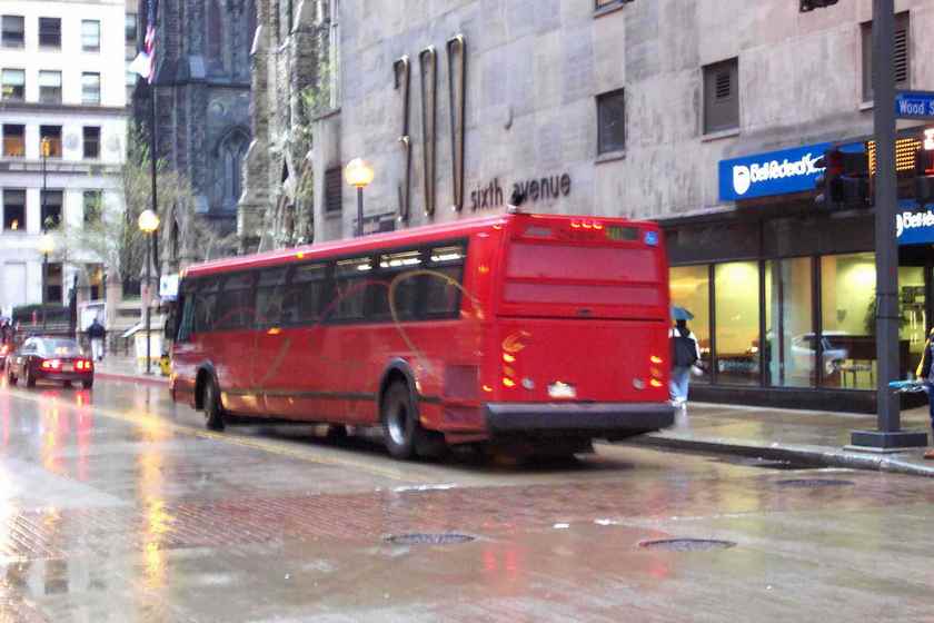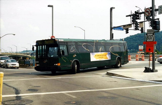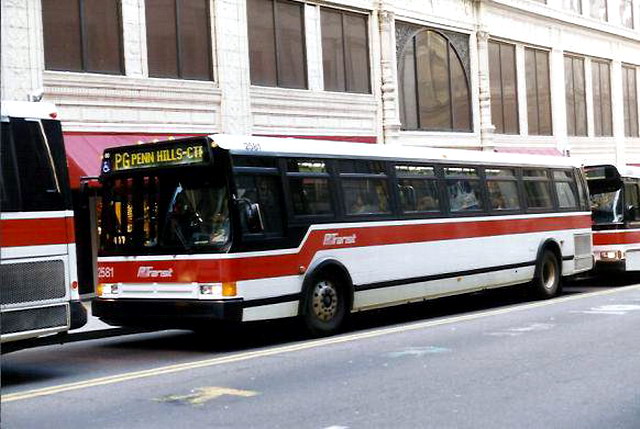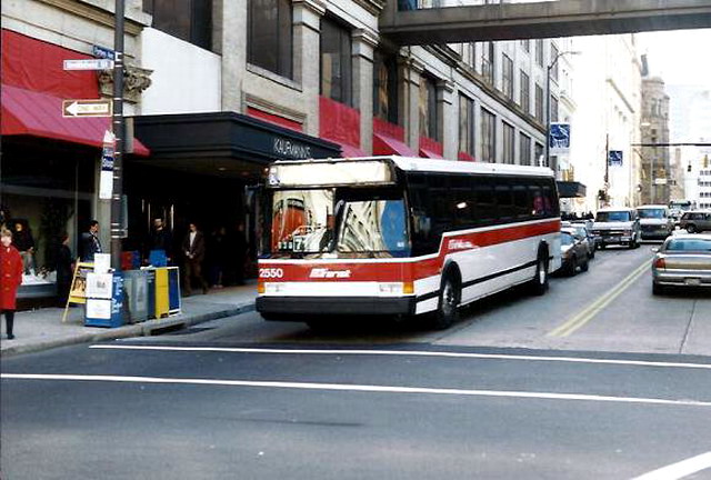 2550 on 5th Ave at Smithfield. this bus and 2581 (below) were involved in a head-on accident on the East Busway when still fairly new, killing one operator and destroying both buses.