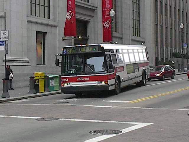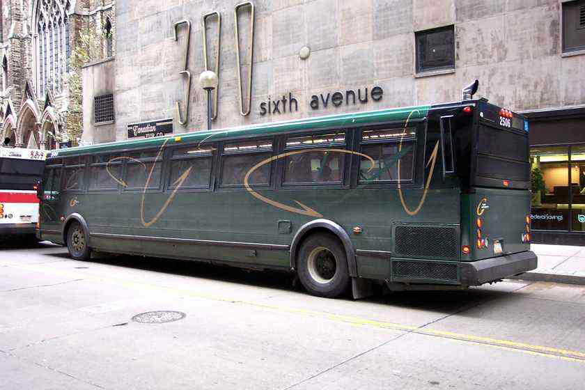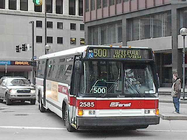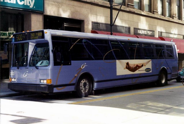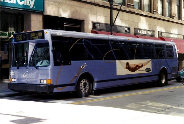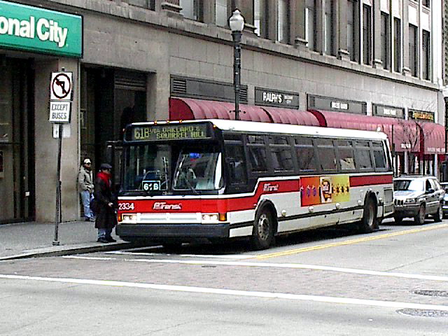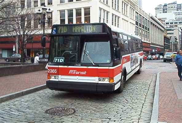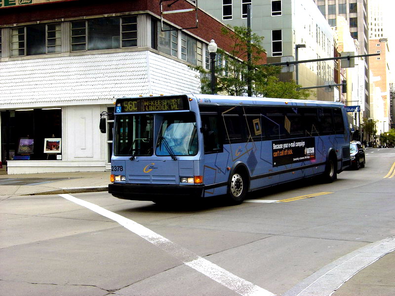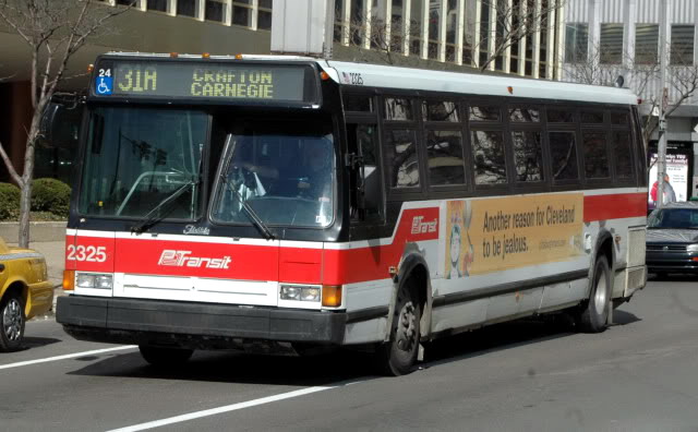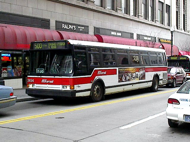 2550 on 5th Ave at Smithfield. this bus and 2581 (below) were involved in a head-on accident on the East Busway when still fairly new, killing one operator and destroying both buses.