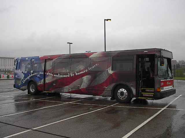 After 9-11, most transit companies dedicated a bus to America. We were no different. here is 2370 adorned in her "America" wrap. Very nice.
