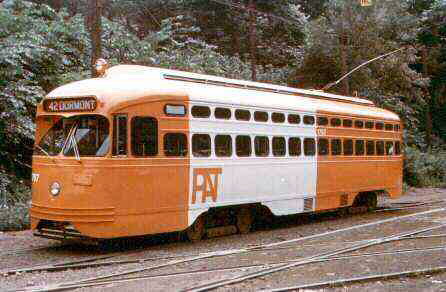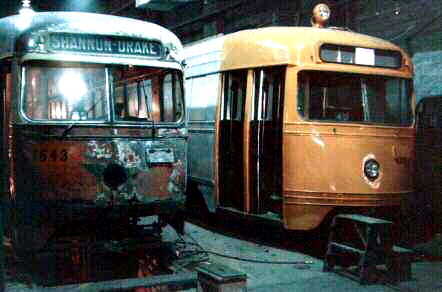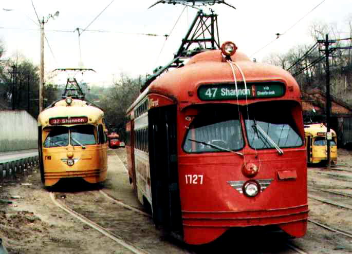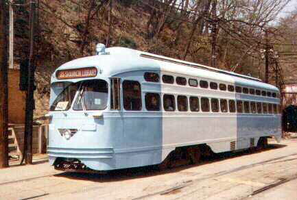 A view of 2 PCC cars sitting awaiting time to go, notice the pantographs! Shot at South Hills Junction.