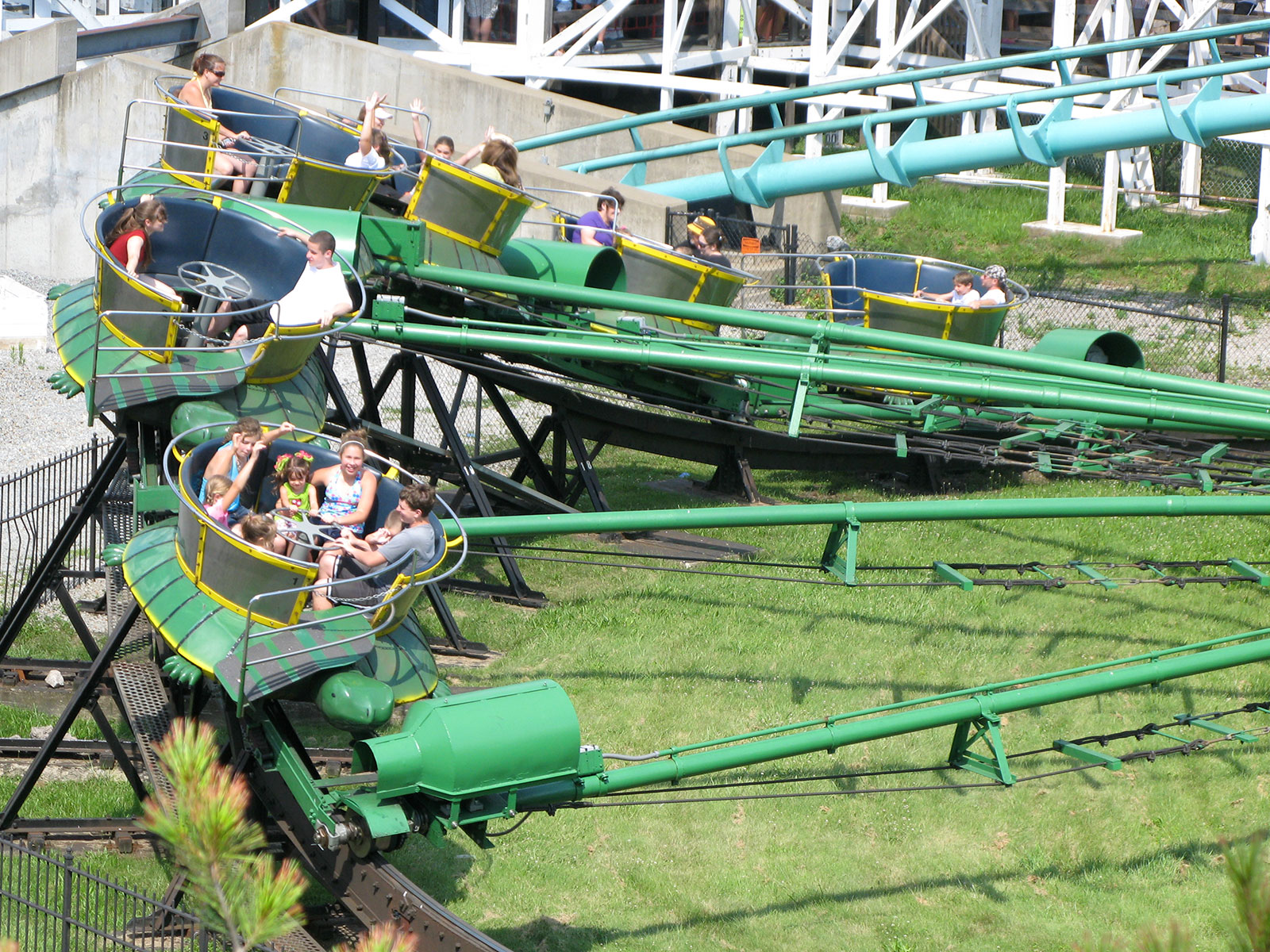 This is a bumpy-track or undulating ride with six cars that travel counter-clockwise on a circular track over a series of three hills and dips. Originally called the Tumble Bug, the ride featured bug-themed cars until it received new turtle-like exteriors. The Turtle is one of only two operating rides of its kind and the only known Turtle variant of the Tumble Bug left in existence.