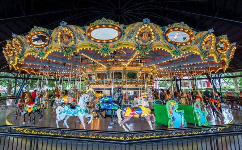 Referred to simply as the carousel by many, the Merry Go Round is a Pittsburgh History and Landmarks Foundation Historic Landmark and is Kennywood's third and largest carousel. Originally commissioned by the U.S. Government for the 1926 Philadelphia Sesqui-Centennial Exposition, it was not completed in time and was purchased by Kennywood. It is also the last carousel that was ever built by William Dentzel. There are 50 jumping and 14 stationary horses. The only two non-horse animals featured on the ride are the tiger and the lion. It is one of four rides at Kennywood with a ride start/stop bell that dates back to the origin of the ride and features over 1500 lights.