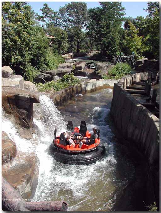 This ride was opened in 1985 and simulates a white-water rafting trip through canyons and beneath waterfalls. Three pumps are constantly filling the cement trough with 93,000 gallons of water each minute.