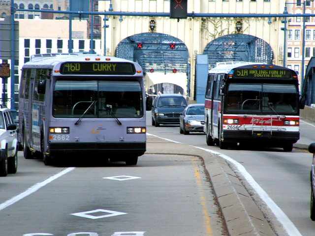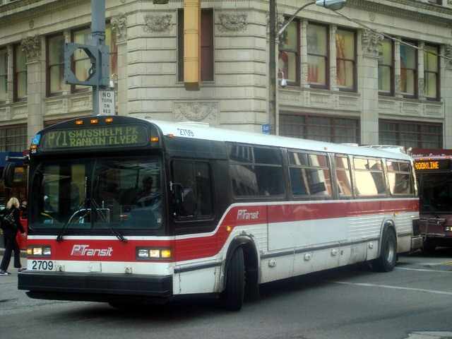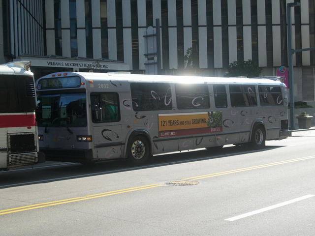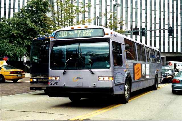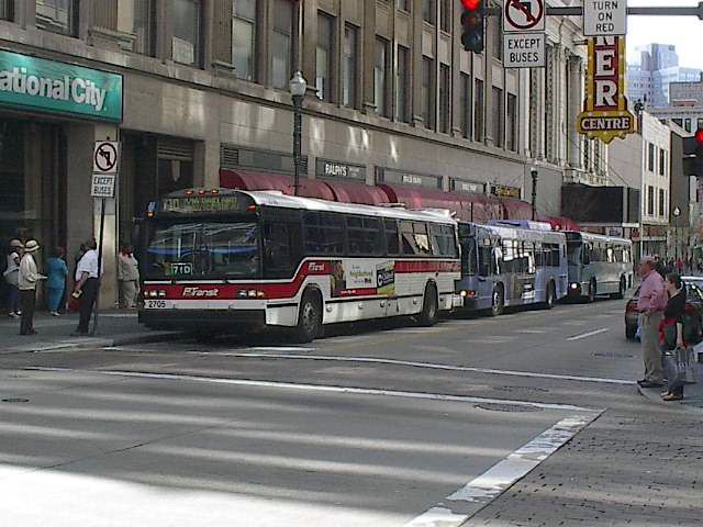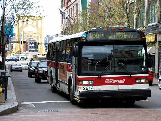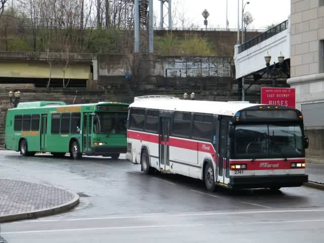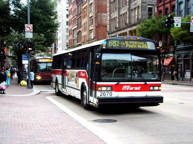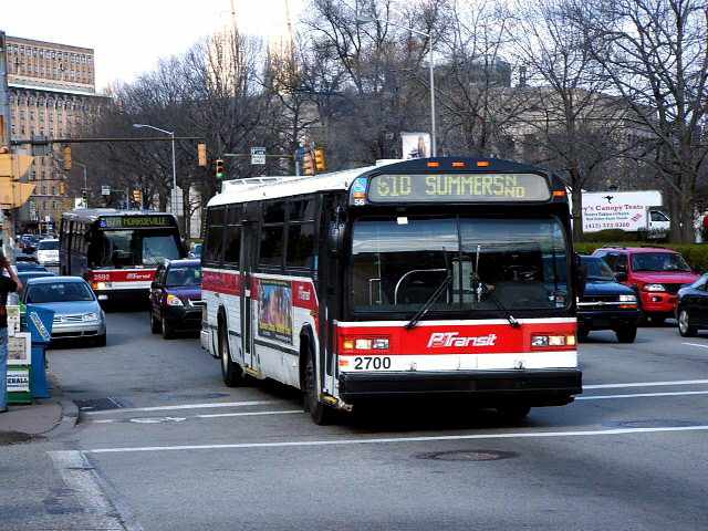 2705 loading on 5th Ave in Pittsburgh, with a unknown Neoplan low floor and an Orion in the back.