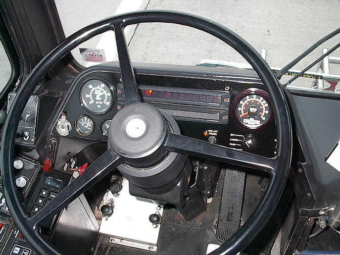 This is the drivers area of the Classic. The really strange thing some drivers do not care for is the positioning of the brake and the throttle pedals, and the angles used, as opposed to other buses. Otherwise, its simplicity.