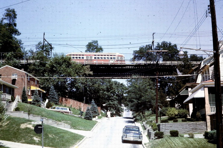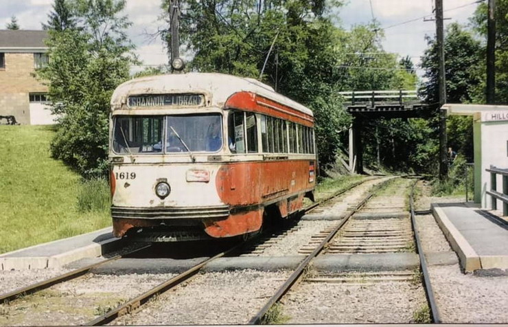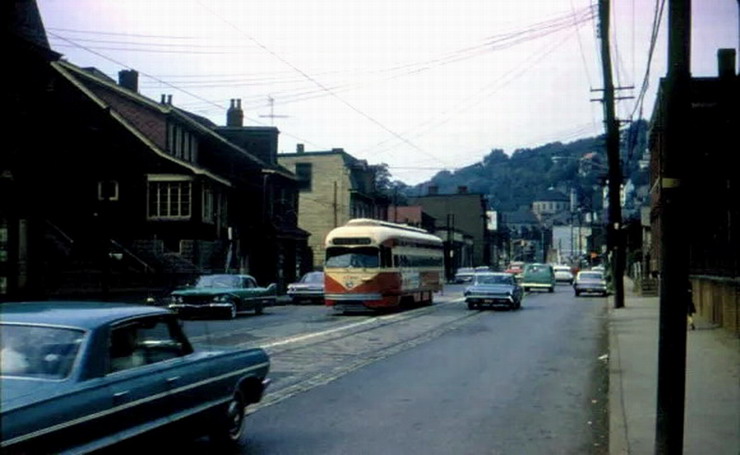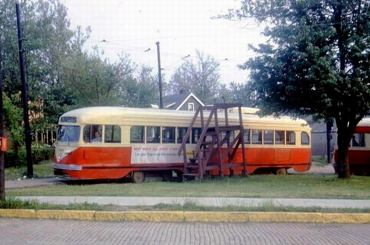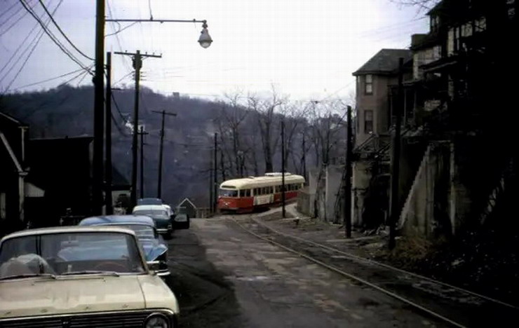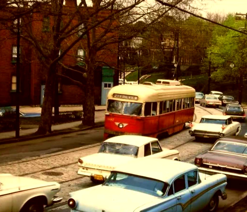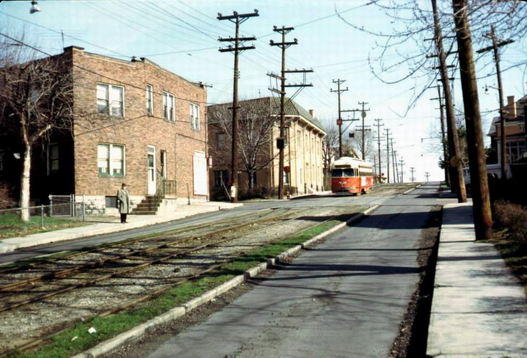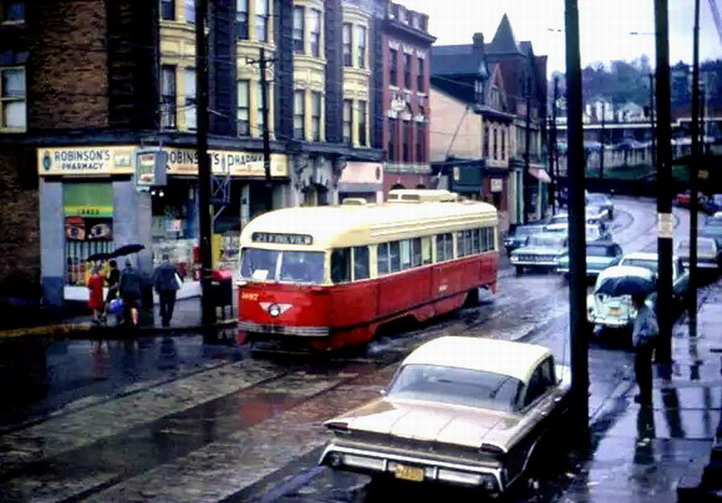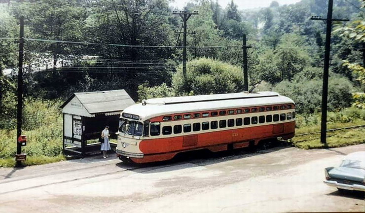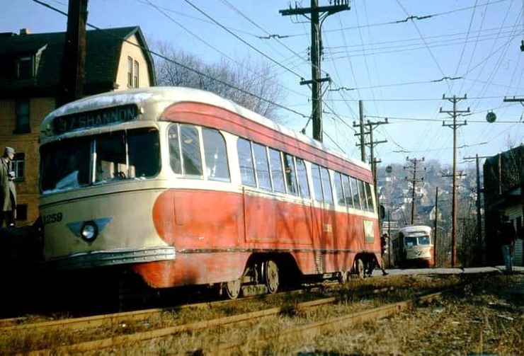 This is one of the very few Pittsburgh PCCs equipped with super resilient wheeled trucks. 1257 also had them. This is 1257 & 1259 pair stopped at Glenbury St on the Overbrook/Shannon line near the intersection of routes 51 and 88.