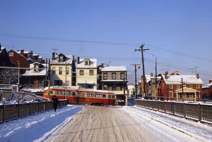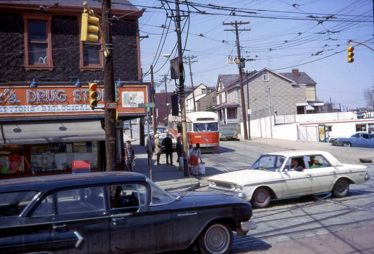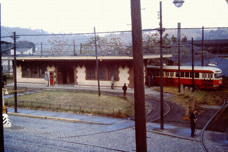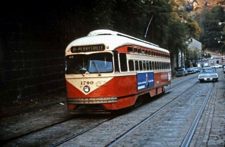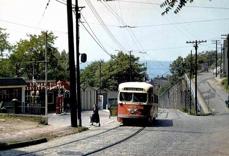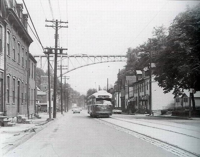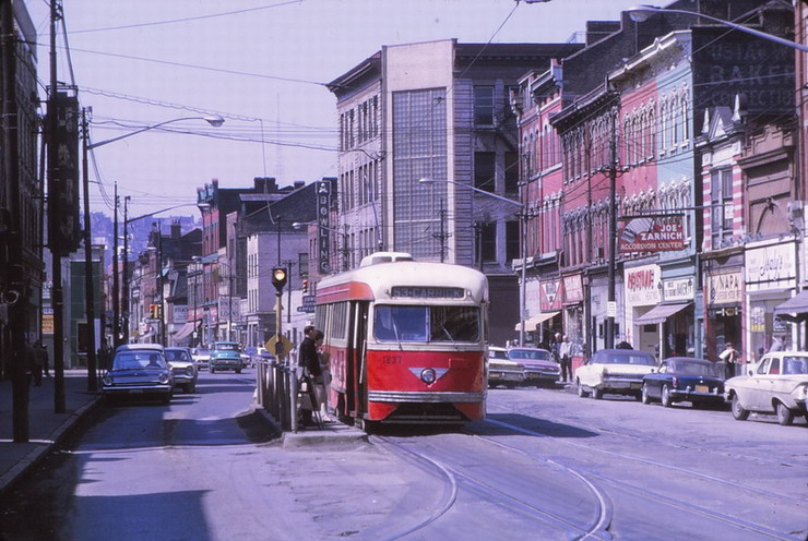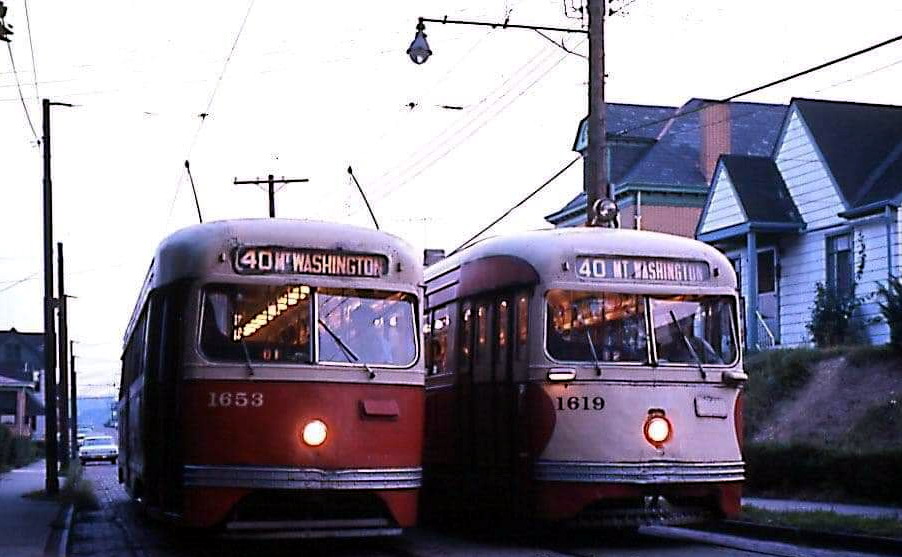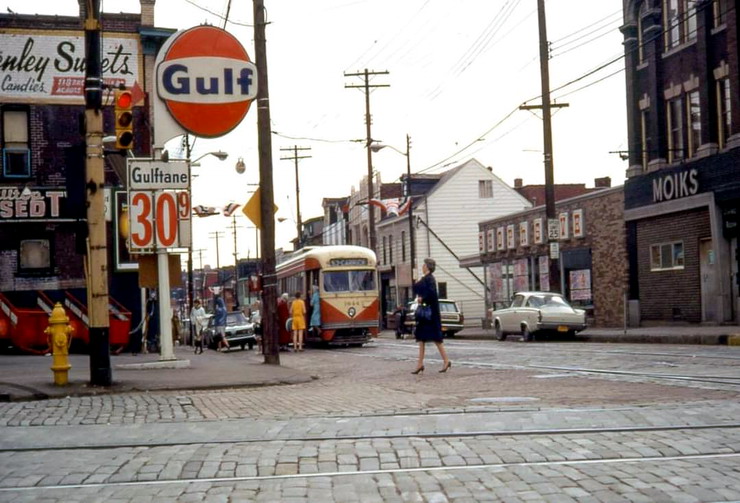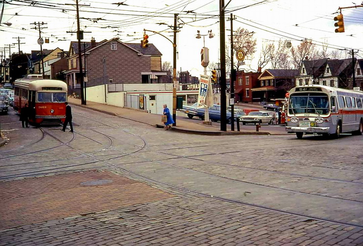 This is one of the very few Pittsburgh PCCs equipped with super resilient wheeled trucks. 1257 also had them. This is 1257 & 1259 pair stopped at Glenbury St on the Overbrook/Shannon line near the intersection of routes 51 and 88.