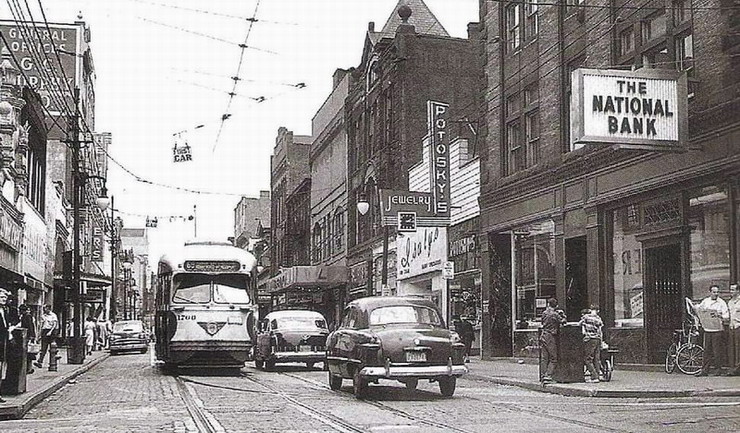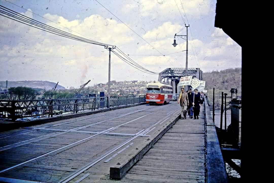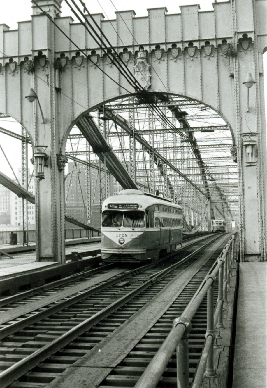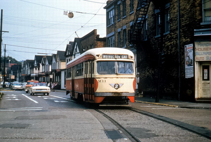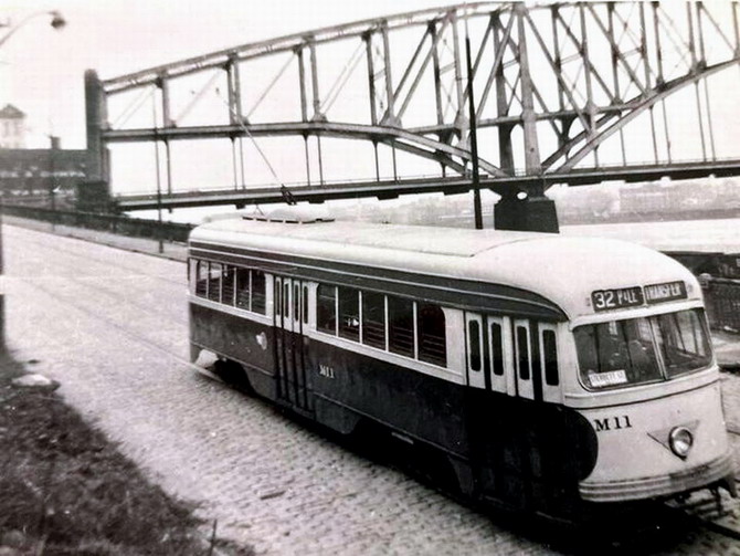 M11 on West Carson Street, old Point bridge in the background, running the P&LE Transfer.