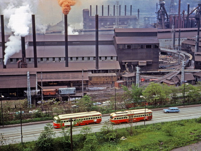 Two 17XX series PCCs running on Braddock Ave, in the back of Edgar Thompson Works.