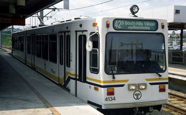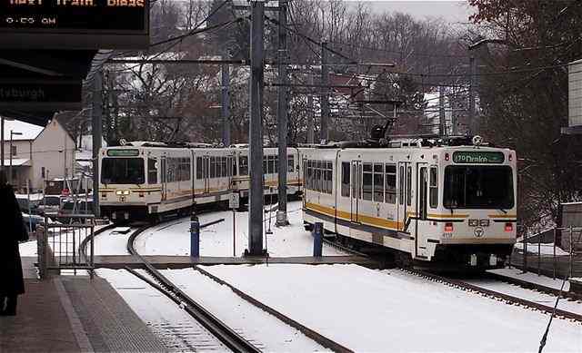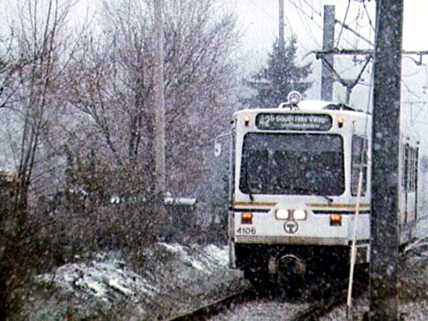 Car 4142 quietly sneaking though Castle Shannon on a snowy day close to Christmas time!