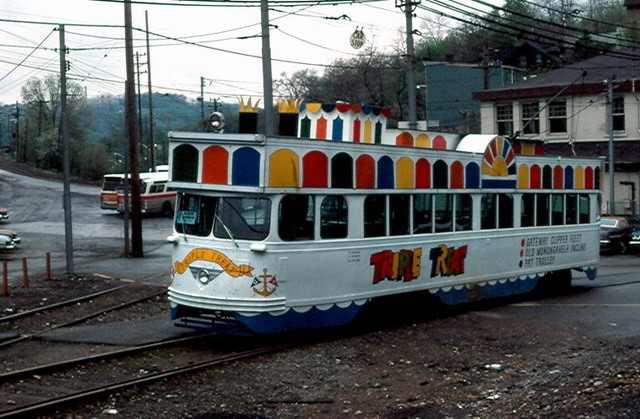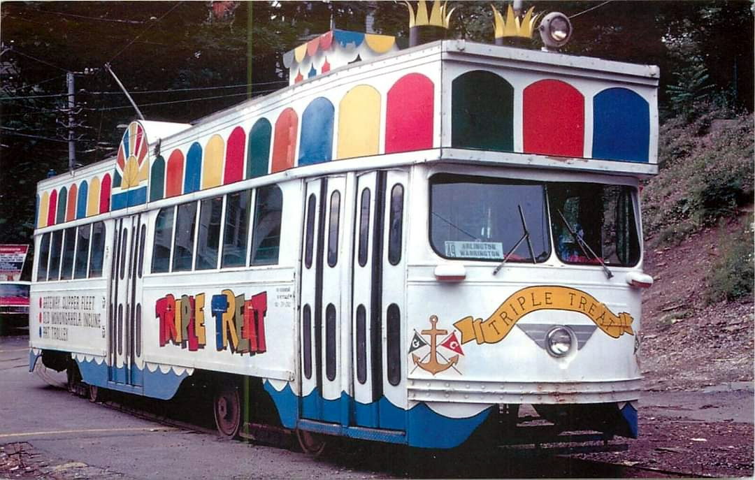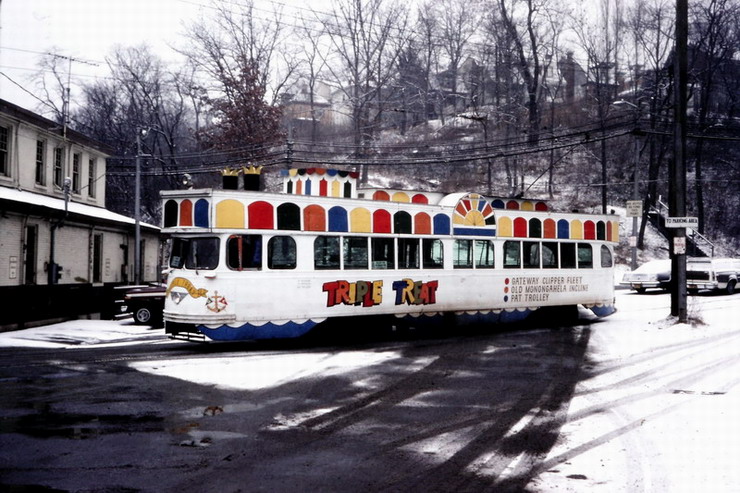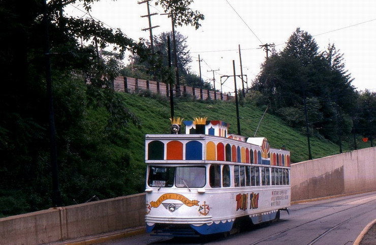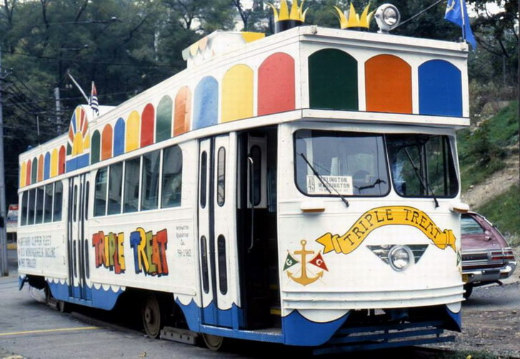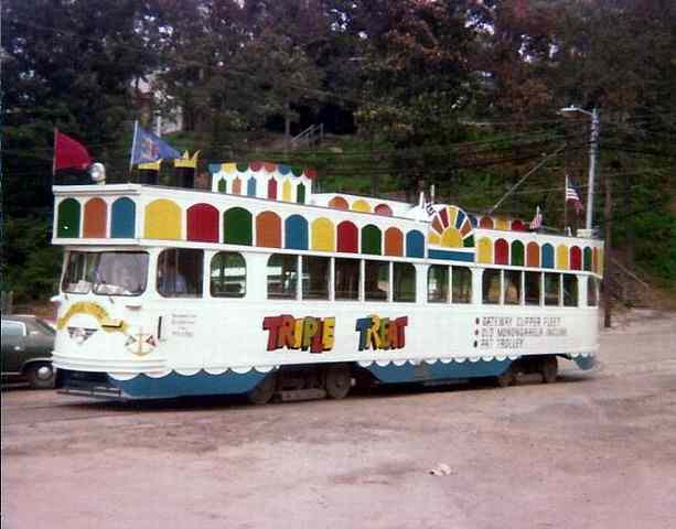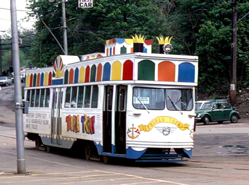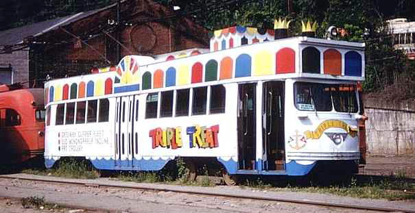 The Triple Treat car. Great advertising for the Gateway Clipper Fleet. Too bad the "stacks" wouldn't fit in the transit tunnel...This car spent all of its time on the Allentown line.