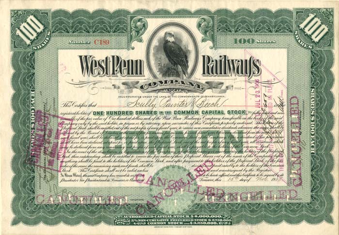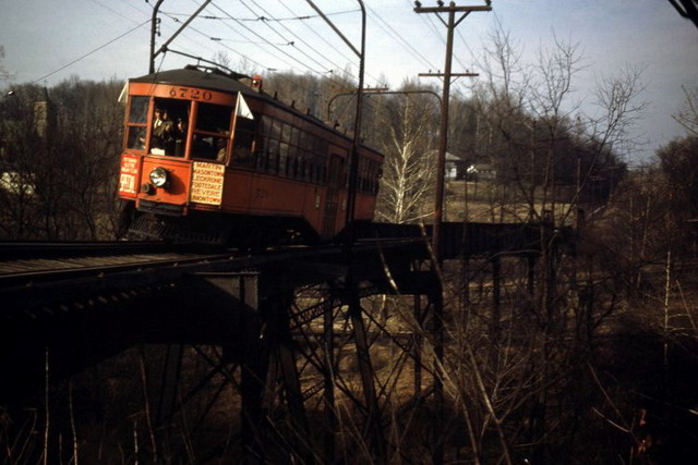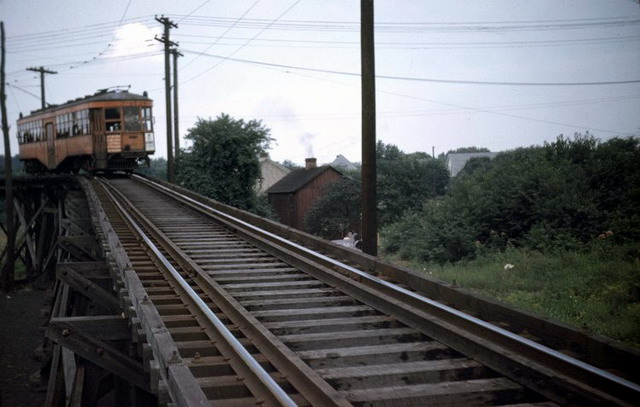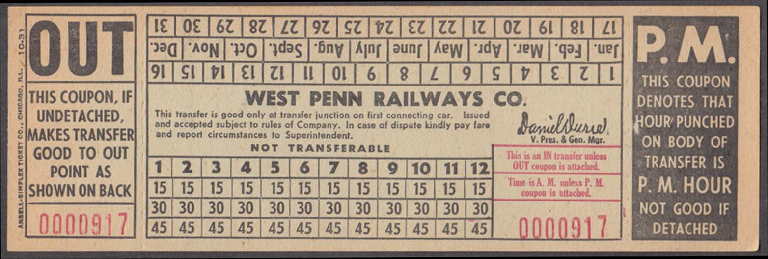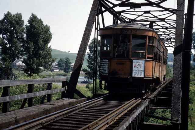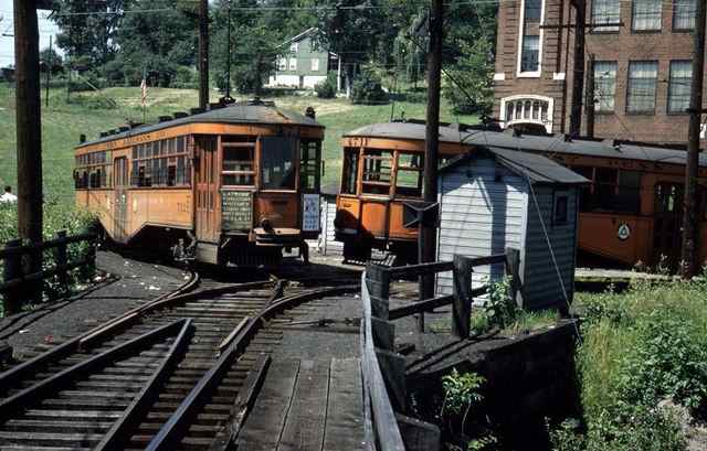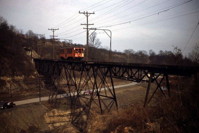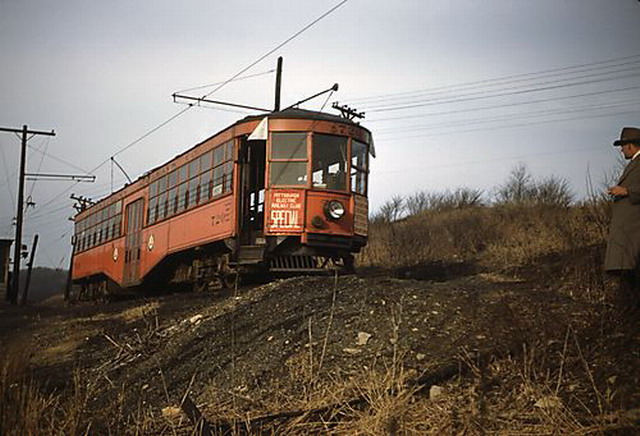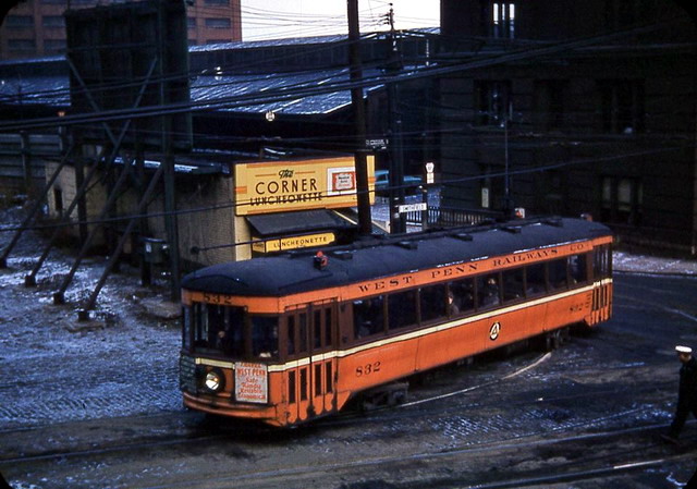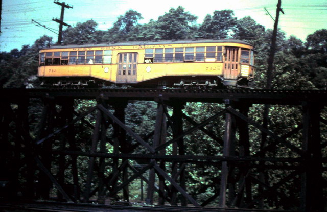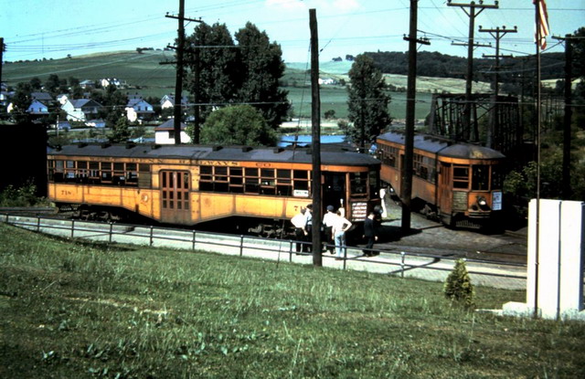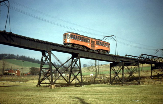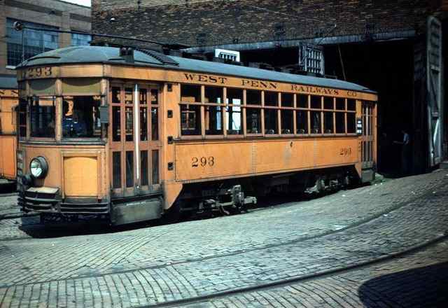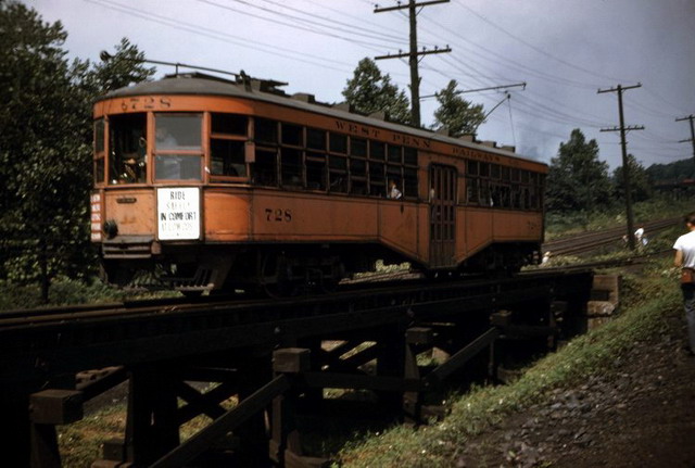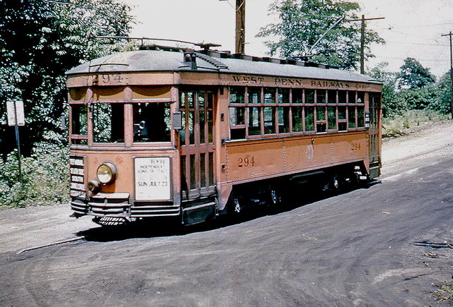 West Penn Railways consisted of 339 miles (546 km) of railway at its peak. Some of its predecessor companies had operated as early as 1889 in the Greensburg area and 1863 in the Wheeling area. West Penn Railways Company, as a distinct corporate entity, was chartered on February 18, 1904. It operated until August 9, 1952, when its last car ran from Uniontown to Greensburg. Because much of its business was to take residents of outlying areas into the nearby towns for shopping and entertainment, its business declined with the construction of better roads and increased car ownership and use.In the country there were passing sidings at various points and a crude but effective block signal system. West Penn had some very substantial bridges crossing ravines and valleys. Also, as was typical for interurbans, stops were more frequent than for a conventional railroad, curves were tighter, and gradients (slopes) were steeper. Like most interurbans, West Penn's traction equipment was powered by overhead electric lines, and the vehicles resembled trolleys. They were larger and heavier than the typical city street car and were painted bright orange. West Penn's broad gauge single track was laid in streets in towns, but in countryside the track often ran on a right-of-way separate from roads. At some points, the West Penn's single track would reenter a road in order to use a road bridge and run not in the center but on one side.